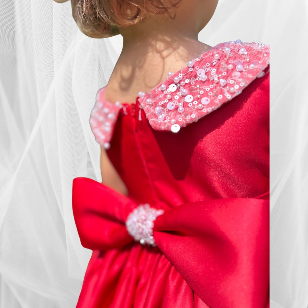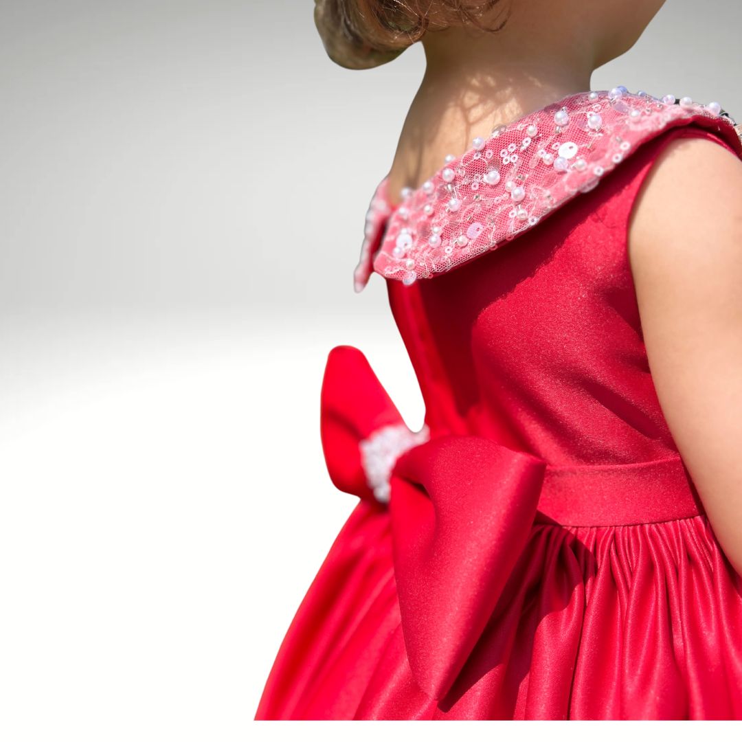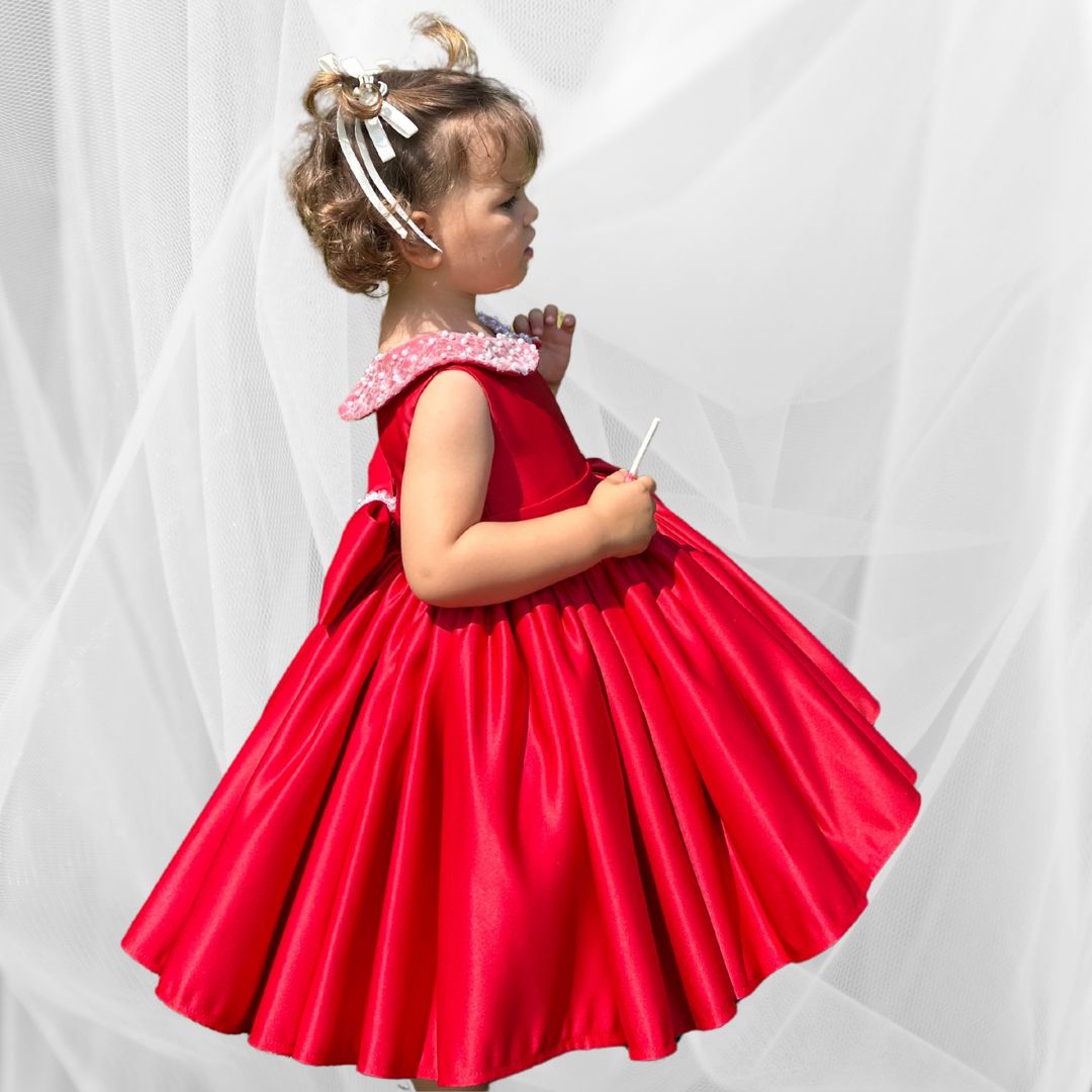 Ein echter Blickfang in leuchtendem Rot – dieses handgefertigte Kleid bringt jede kleine Prinzessin zum Strahlen. Der glänzende Stoff, der süße Schnitt und der mit Perlen verzierte Kragen machen es ideal für festliche Anlässe oder unvergessliche Momente.