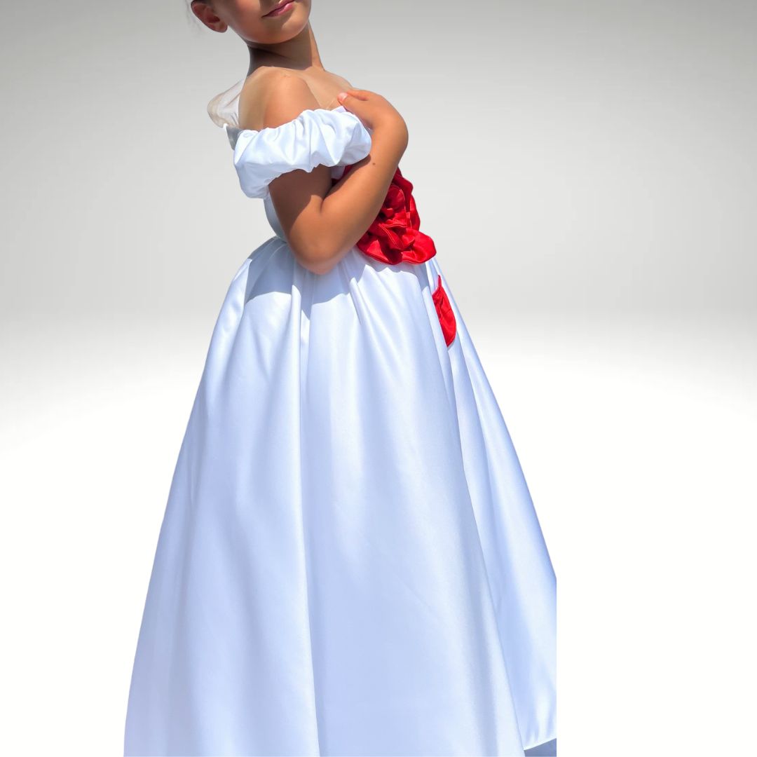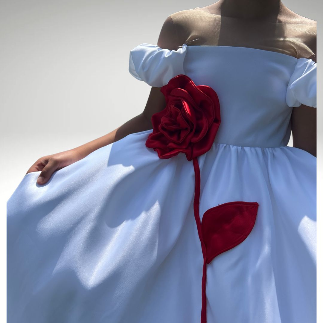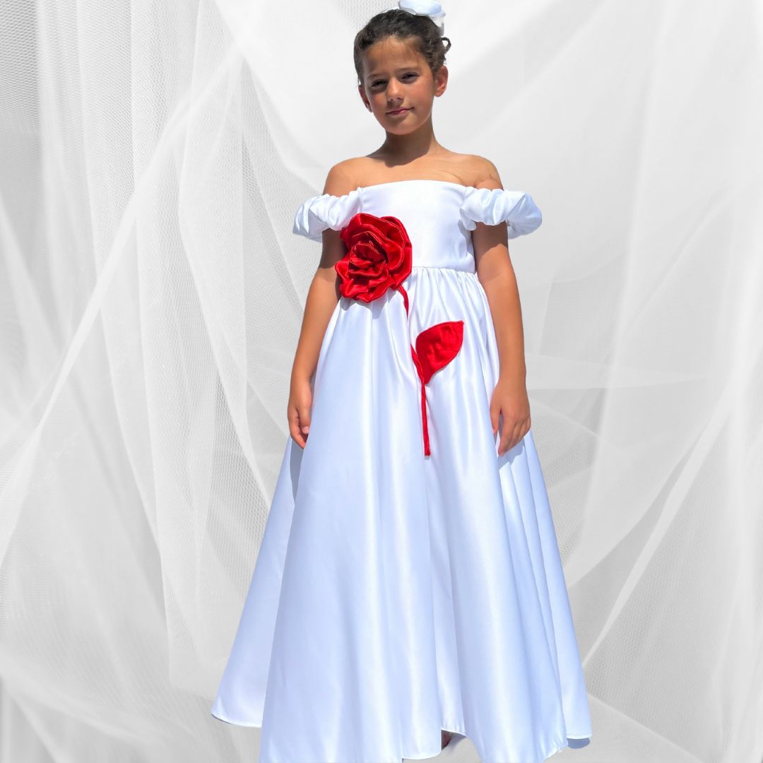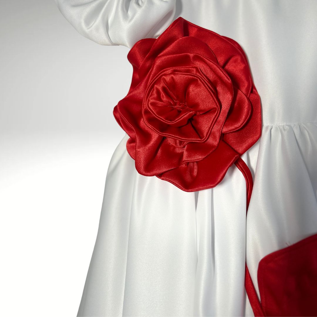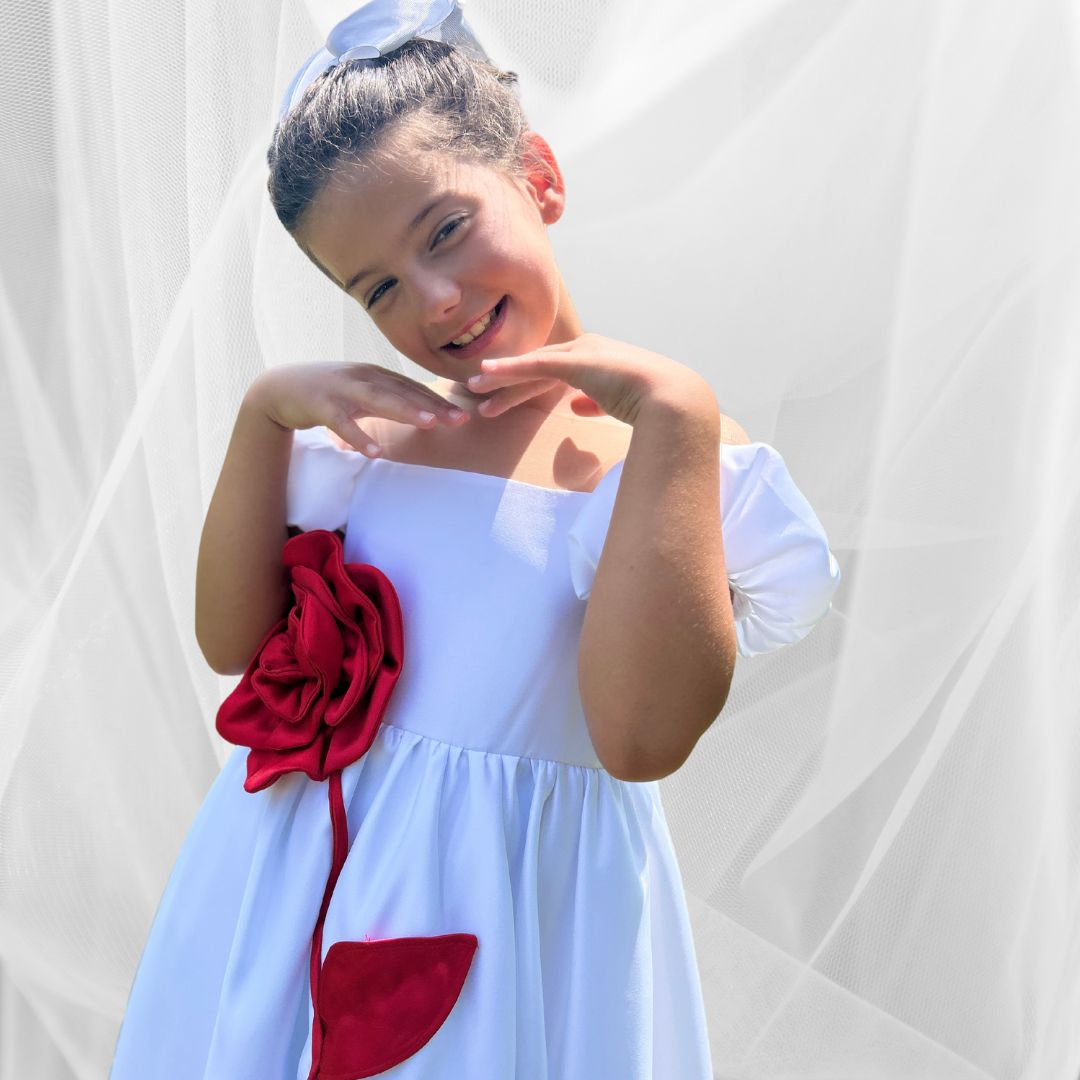 Ein Traum in Weiß mit einem Hauch Romantik – unser Kleid Rosenzauber ist ein echter Blickfang für kleine Prinzessinnen. Das schulterfreie Design, der fließende Schnitt und die große handgefertigte rote Stoffrose verleihen dem Kleid eine elegante und zugleich verspielte Ausstrahlung.